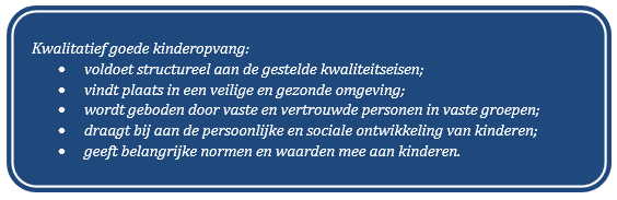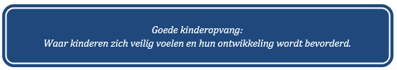 Kinderopvang heeft een belangrijke plaats in onze samenleving. Kwalitatief goede kinderopvang draagt bij aan een goede start voor kinderen in de maatschappij en draagt bij aan een goede ontwikkeling en aan het welbevinden van kinderen. In de kinderopvang moeten kinderen zich veilig voelen en de ruimte krijgen om zich te ontwikkelen (denk aan sociale emotionele-, cognitieve- en taalontwikkeling). Het gaat daarbij om een brede ontwikkeling met aandacht voor sociale activiteiten zoals samen spelen, samenwerken en leren van en met elkaar. Zo draagt kinderopvang bij aan een goede start voor kinderen in het basisonderwijs en de samenleving.