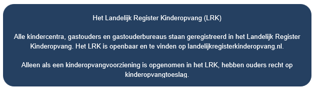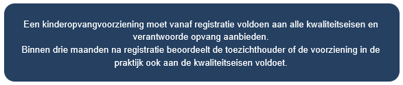 Het bevorderen van de ontwikkeling van kinderen. De houder van een kinderopvangvoorziening is verantwoordelijk voor het leveren van kwalitatief goede kinderopvang. Het is belangrijk dat direct vanaf de start van een opvanglocatie verantwoorde en kwalitatief goede kinderopvang wordt aangeboden. Ouders moeten erop kunnen vertrouwen dat ze hun kind in een veilige en gezonde, stimulerende en vertrouwde omgeving achterlaten. In het Landelijk Register Kinderopvang (LRK) staan alle organisaties die toestemming hebben gekregen om kinderopvang aan te bieden. In het register staan de contactgegevens van de organisaties, de onderzoeksrapporten van de toezichthouder en de handhavingsmaatregelen die het college heeft genomen.