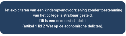 Als een kinderopvangvoorziening start zonder hiervoor schriftelijke toestemming te hebben gevraagd of verkregen, is sprake van niet gemelde oftewel illegale kinderopvang. Dit is een ernstige overtreding die het college niet wil. In dat geval kan het college niet zorgen voor verantwoorde en veilige opvang voor kinderen. Het college treedt hiertegen dan ook streng op. De locatie moet meteen sluiten en de houder kan een bestuurlijke boete krijgen ook kan het college aangifte doen bij het Openbaar Ministerie.