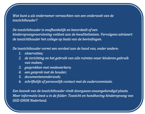Minimaal 1 keer per jaar bezoekt de toezichthouder onaangekondigd ieder gastouderbureau, kinderdagverblijf en iedere locatie met buitenschoolse opvang. Daarnaast bezoekt de toezichthouder ook jaarlijks ten minste 50% van de geregistreerde voorzieningen voor gastouderopvang, waarbij iedere gastouderlocatie ten minste eens per 3 jaar bezocht wordt.