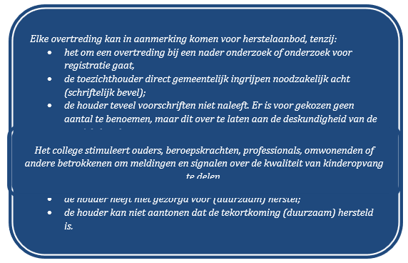 Het college spreekt houders aan op de eigen verantwoordelijkheid voor de kwaliteit van hun aanbod. Zodra de kwaliteit tekortschiet, spoort het college de houder aan om deze tekortkomingen snel en structureel te herstellen. Het resultaat van een herstelaanbod kan voor het college reden zijn om niet direct bestuurlijk te handhaven. Door kinderopvanghouders hiertoe in de gelegenheid te stellen, worden tekortkomingen eerder hersteld en kan het college onnodig handhaven voorkomen. Dat kan bijvoorbeeld passend zijn als overtredingen zijn hersteld of als uit het inspectierapport blijkt dat een overtreding binnen afzienbare periode is hersteld.