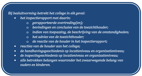 Het college hecht daarbij grote waarde aan het oordeel van de toezichthouder en betrekt dit in de besluitvorming. Ook een reactie van de houder op een inspectierapport betrekt het college bij de beoordeling.