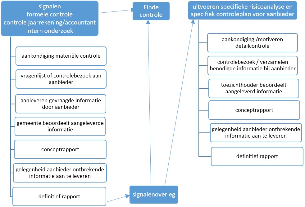 De Regeling Jeugdwet stelt dat iedere gemeente verantwoordelijk is voor het doen van de materiële controle. De toezichthouders hebben de taak om onafhankelijk - binnen hun wettelijke mandaat – onderzoek te doen naar de rechtmatigheid van jeugdzorgaanbieders. Zij zien toe dat organisaties de wet- en regelgeving naleven. Dit doen toezichthouders door proactief en reactief onderzoek te doen op basis van één of meerdere signalen die binnenkomen vanuit de de gemeente of daarbuiten).