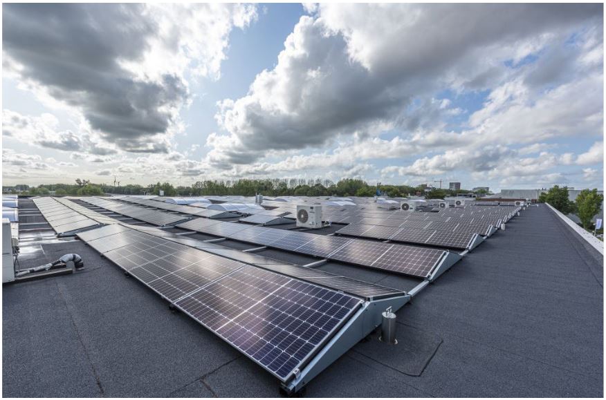 Beeld zonnepanelen op het dak van een bedrijfshal