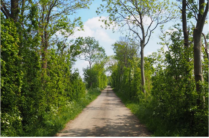 Het bestaande stelsel van beplante wegen geeft uitdrukking aan het agrarische landschap dat na 1953 is aangelegd. Hierin komen de verschillen tussen de diverse polders van Schouwen-Duiveland het beste tot uiting. Nu we gaan inzetten op bomen op de dijken willen we de wegbeplanting daarmee in samenhang ontwikkelen. Nabij dijken willen we vooral de wegen die naar de dijken toelopen meer aandacht gaan geven. Daarmee ontstaat het hoofdpatroon. Waar beplante wegen beplante dijken kruisen ontstaan bijzondere punten. Ook het netwerk van wegbeplantingen heeft invloed op het diepe landschap. Daar waar deze beplanting dichter is, ontstaat een coulissenlandschap. Omdat er niet overal bomenrijen staan is hier en daar het landschap in de volle diepte waarneembaar.