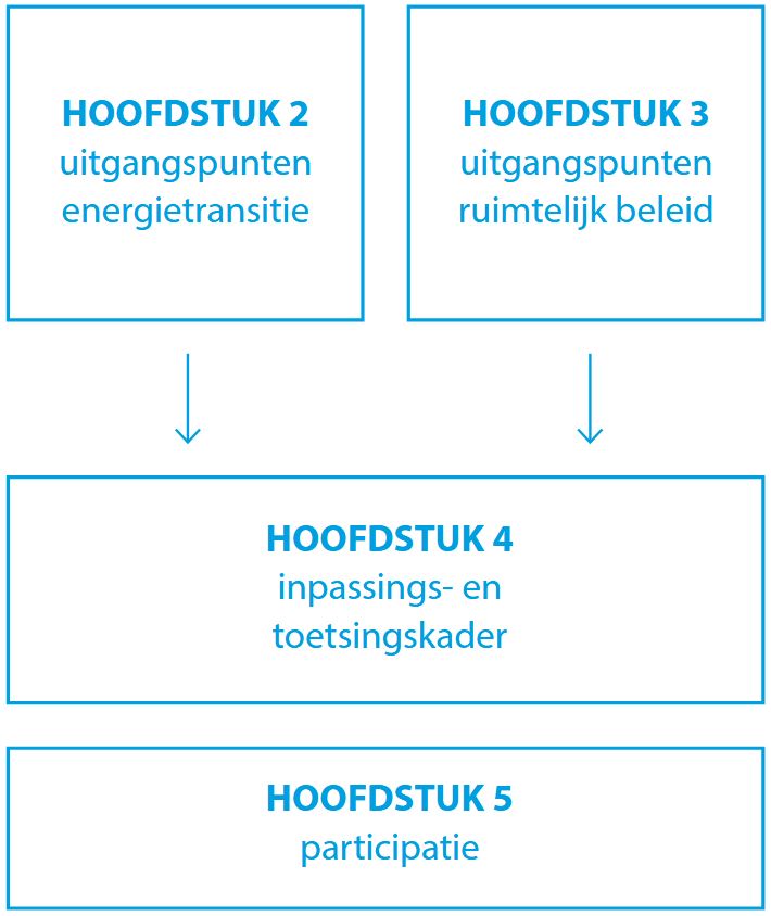 In hoofdstuk 2 geven wij een beschrijving gegeven van de opgave in het kader van energietransitie en de benodigde duurzame energieopwekking. In hoofdstuk 3 geven wij de ruimtelijke opgave weer met een korte beschrijving van de gebiedsprofielen en een beschrijving van de belangrijkste landschappelijke eenheden. Dit betreft identiteit en kwaliteit, ruimte voor duurzame energie en voorwaarden voor landschappelijke inpassing. Tevens kijken wij naar de koppelkansen met andere opgaven als biodiversiteit, klimaatadaptatie en circulariteit. In hoofdstuk 4 geven wij het ruimtelijk inpassings- en toetsingskader voor duurzame energie-initiatieven. In hoofdstuk 5 geven wij de randvoorwaarden weer voor proces- en financiële participatie bij duurzame energieprojecten. In bijlage 5 geven wij een overzicht van de belangrijkste definities.