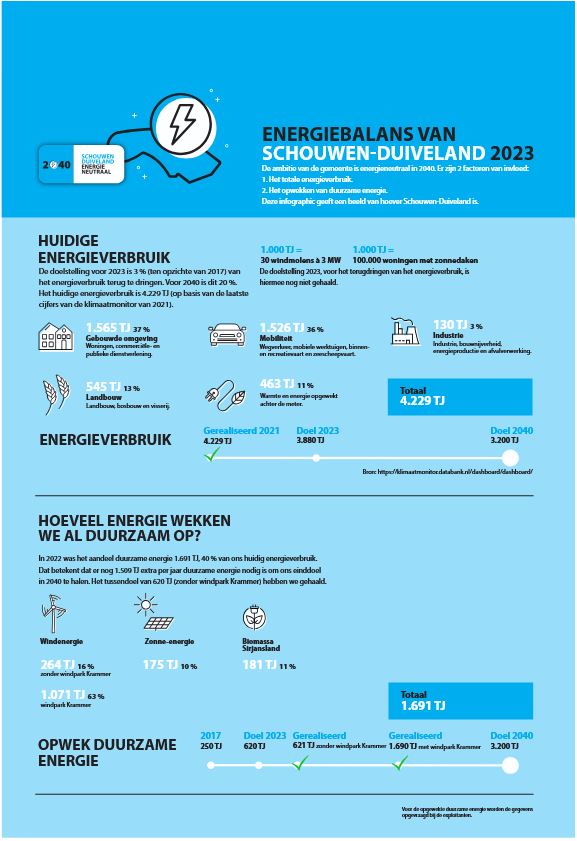 In de jaarlijkse energiebalans wordt het energie- verbruik en de duurzame energieopwekking gemonitord. De factsheet energiebalans 2023 is als bijlage (1) bijgevoegd. Uit de energiebalans blijkt dat in 2022 op Schouwen-Duiveland al ongeveer 1700 TJ aan duurzaam energie wordt opgewekt. De opgave om in 2040 energieneutraal te worden is een extra duurzame energieopwekking van ongeveer 1500 TJ (3200 TJ – 1700 TJ) nodig. Om een beeld te geven wat dit betekent: 1500 TJ komt overeen met 45 windturbines van 3 MW, 135 hectare zonnepanelen of met 150.000 woningen met zonnedaken. Er is dus nog een flinke weg te gaan om energieneutraal te worden.