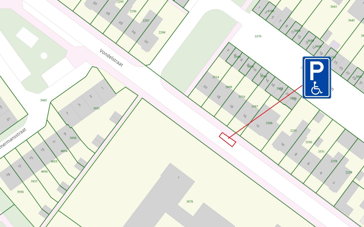 dat de gevraagde gehandicaptenparkeerplaats ingesteld kan worden als aangegeven op bijgaande tekening, in de Vondelstraat te Hulst voor de woning van de aanvrager, door bord E6 van bijlage I behorende bij het “Reglement Verkeersregels en Verkeerstekens 1990” met onderbord te plaatsen waarbij het parkeren wordt verboden, met dien verstande dat het verbod niet geldt voor het motorvoertuig waarmee de aanvrager, zich pleegt te vervoeren dan wel waarmee zij vervoerd wordt;