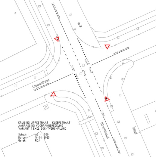 door het plaatsen van de verkeersborden B3 en B6 van bijlage 1 van het RVV 1990 en het aanbrengen van haaientanden op het wegdek, een voorrangskruispunt in te stellen op het kruispunt Kleefstraat – Lippestraat, waarbij bestuurders die vanaf de Lippestraat het kruispunt naderen voorrang dienen te verlenen aan bestuurders op de Kleefstraat.