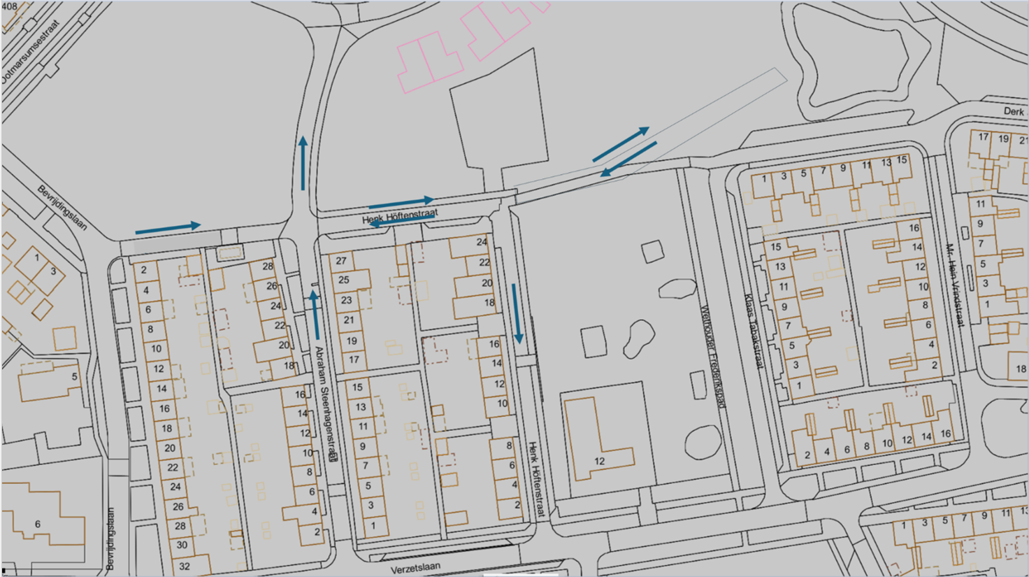- Onder ‘motivering’ in de tweede alinea staat vermeld dat de Henk Höftenstraat, die in de huidige situatie een eenrichtingsweg is, wordt aangepast naar een tweerichtingsweg. Dit moet zijn; ‘Daarnaast wordt de Henk Höftenstraat, die in de huidige situatie een eenrichtingsweg is, gedeeltelijk aangepast naar een tweerichtingsweg waarbij de wijziging plaatsvindt op het traject aan de kopse kant van het huizenblok tussen de kruising Abraham Steenhagenstraat, Henk Höftenstraat en de bocht van de Henk Höftenstraat, waaraan een nieuwe straat wordt aangetakt.