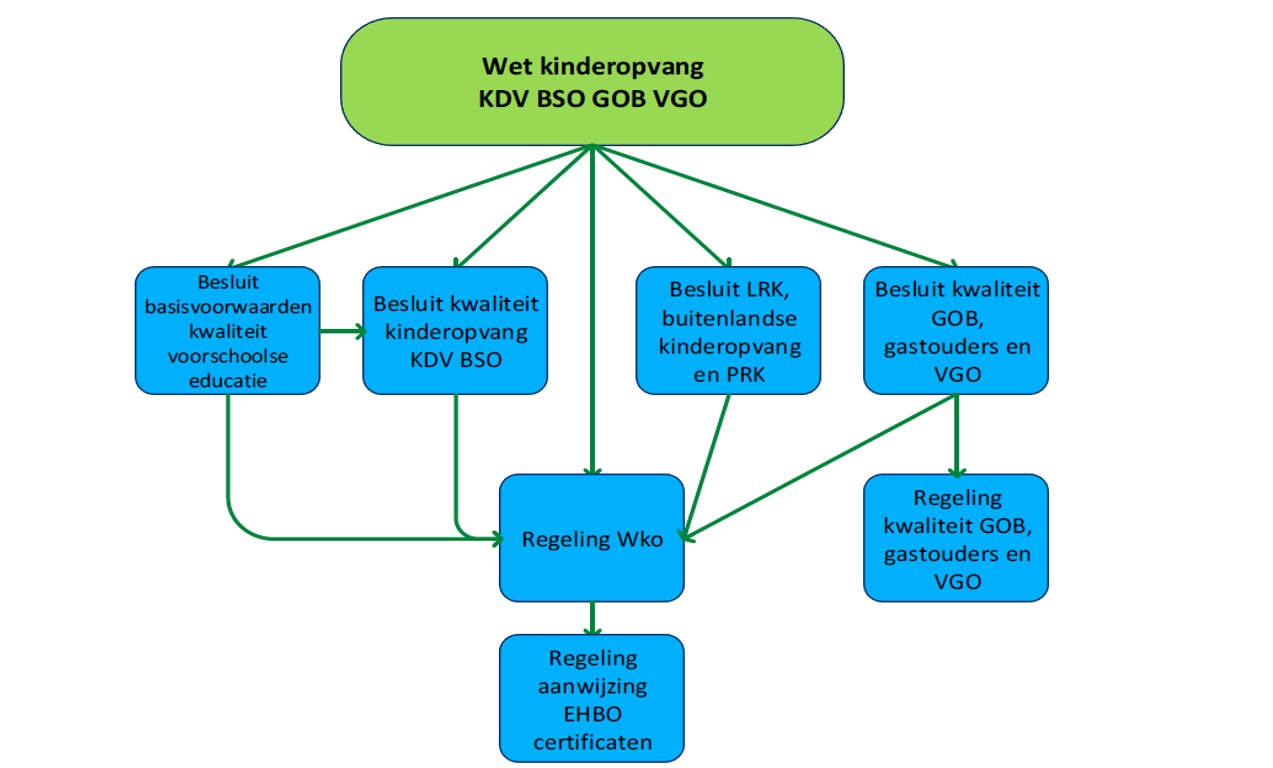 In de Wet kinderopvang staat het raamwerk van voorschriften die de aanbieders van kinderdagverblijven, buitenschoolse opvang, gastouderbureaus en voorzieningen voor gastouderopvang moeten naleven. De Wet kinderopvang (verder: Wko) is uitgewerkt in nadere regelgeving die wordt beschreven in hoofdstuk 2. Deze regelgeving stelt eisen aan verschillende onderwerpen, ook wel domeinen genoemd, zoals bijvoorbeeld het pedagogisch klimaat of veiligheid en gezondheid.