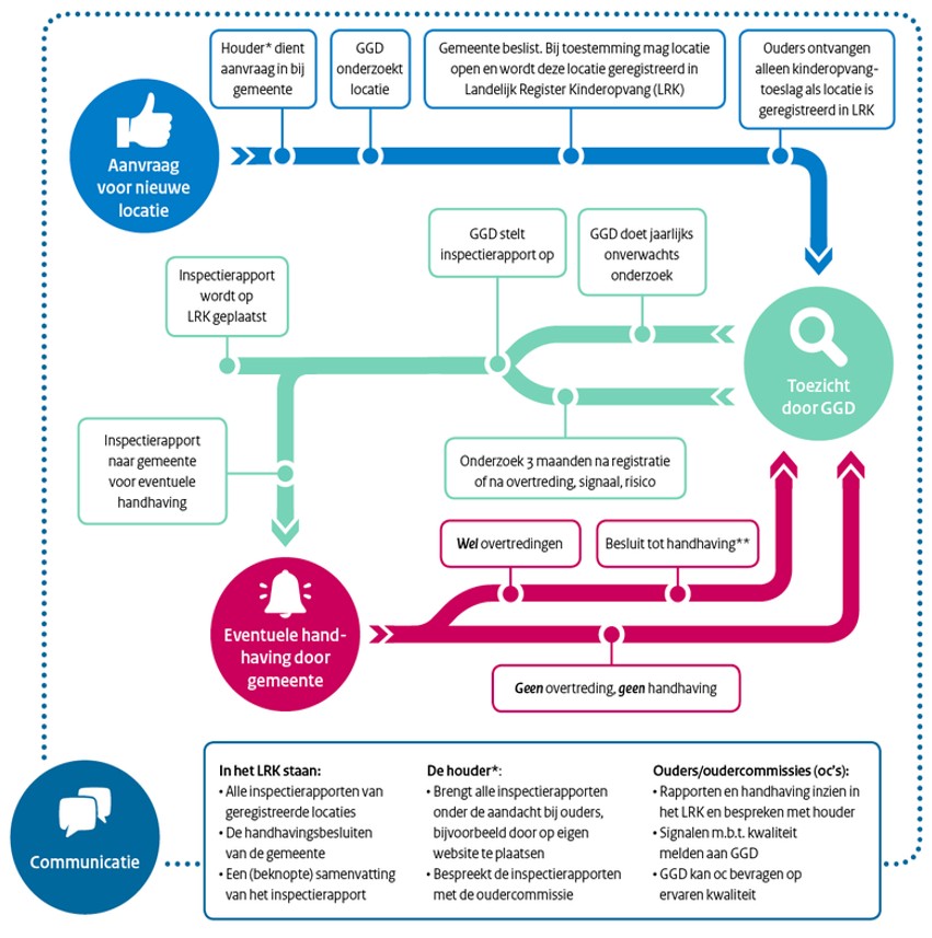 De GGD onderzoekt jaarlijks op alle geregistreerde kinderdagverblijven, voorzieningen voor buitenschoolse opvang en gastouderbureaus de naleving van voorschriften. Bij voorzieningen voor gastouderopvang vindt het GGD-onderzoek tenminste iedere drie jaar plaats.