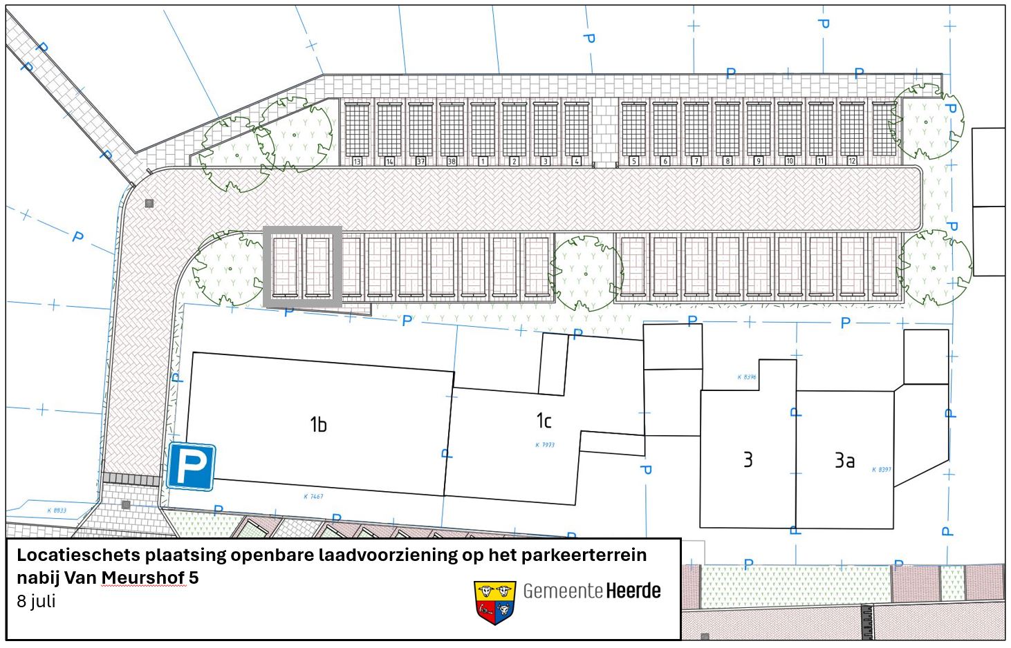 Locatieschets plaatsing openbare laadvoorziening op het parkeerterrein nabij Van Meurshof 5: