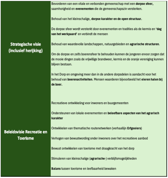 activiteiten zoals bijvoorbeeld combinaties met zorg, recreatie, kunst, winkelverkoop of horeca. Daarbij is voldoende draagkracht van de dorpskern voor verkeersbewegingen en parkeren een belangrijke, toetsende randvoorwaarde. Tot slot zet de gemeente in nop een sterke verbinding tussen de agrariërs en de inwoners. waarbij inwoners actief betrokken worden bij het agrarisch leven en de waardering voor lokale producten en tradities kan groeien.