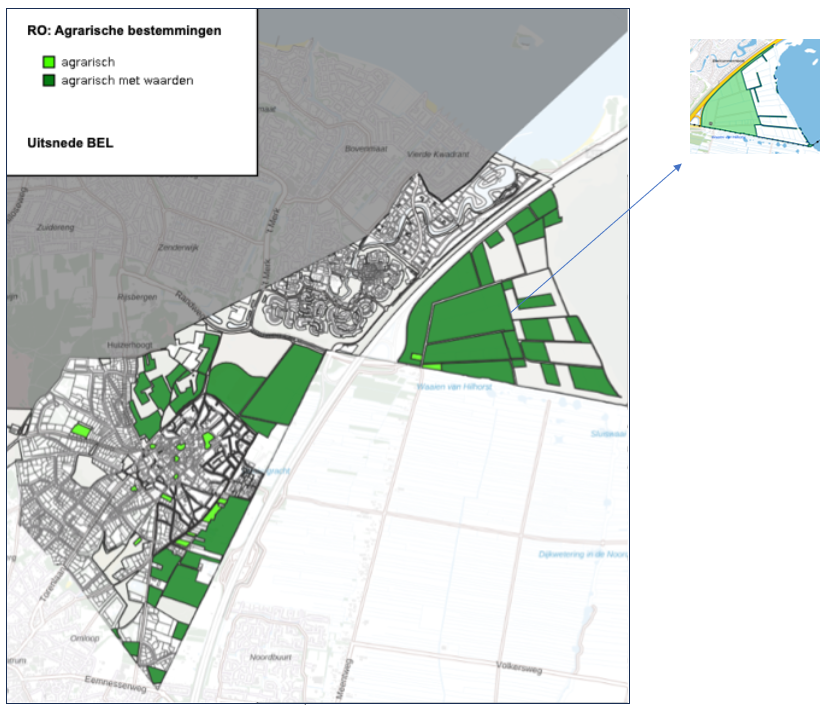 Sinds de vaststelling van de Agrarische Nota in 2011 zijn de agrarische activiteiten in de gemeente verder gekrompen. Deze ontwikkeling heeft geleid tot een afname van actieve agrarische bedrijven, wat de traditionele rol van landbouw als drager van het historisch agrarisch karakter onder druk heeft gezet. Bovendien vergrijst de populatie praktiserende (hobby-)boeren snel, terwijl er bij veel ondernemers geen opvolgingsplannen zijn. Dit gebrek aan opvolging brengt onzekerheid over de continuïteit van agrarische functies in de gemeente met zich mee. Daarnaast bestaat het risico dat boerderijen en erven hun agrarische en verbindende functie in het dorpsleven verliezen door herbestemming van onder andere een enkelvoudige woonbestemming. In figuur 1 tot en met 3 zijn overzichtskaarten opgenomen die de percelen met agrarische bestemmingen laten zien en de eigendomsverhouding daarvan.