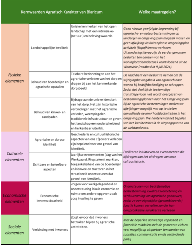 De kernwaarden van het agrarisch karakter zijn gebaseerd op vier elementen: fysieke, culturele, economische en sociale elementen. Deze elementen vormen de basis voor wat we samen in de gemeente willen bereiken, de visie. Om deze visie te verwezenlijken hanteert de gemeente sturende principes en maatregelen. Deze zijn weergegeven in tabel 2 en in de volgende paragrafen verder uitgewerkt.