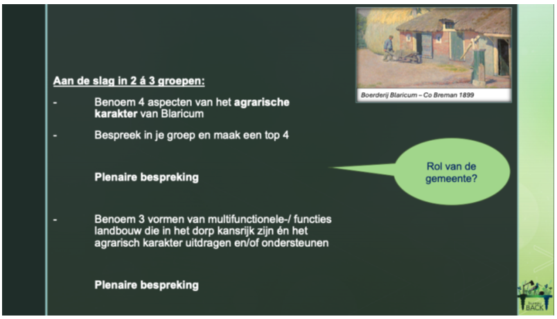In deze bijeenkomst stonden twee centrale vragen centraal in het kader van de actualisatie van de agrarische nota van de gemeente Blaricum: