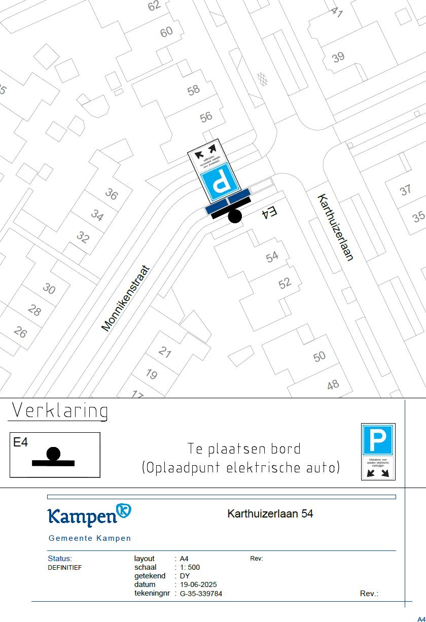 - door middel van het plaatsen van het verkeersbord E4 van bijlage 1 van het RVV 1990 met een onderbord met de tekst ‘opladen elektrische voertuigen’ – en een onderbord met pijlen, waaruit blijkt dat het bord voor twee parkeerplaatsen van toepassing is- op de Karthuizerlaan ter hoogte van nummer 54, een tweetal parkeerplaatsen te reserveren op het aangrenzende parkeerterrein ten behoeve van het opladen van elektrische voertuigen.
