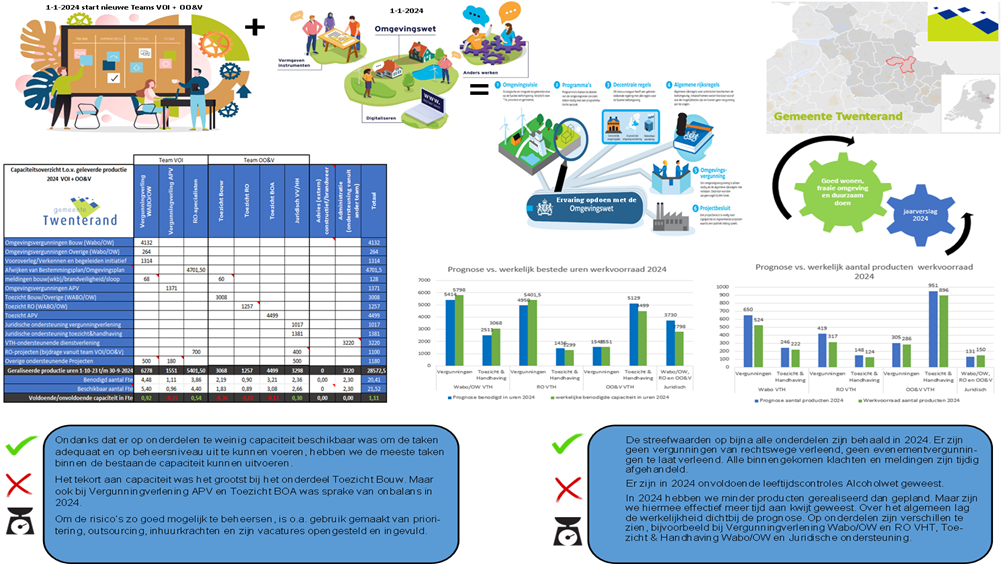 Taakinhoudelijk zijn de teams VOI en THV in 2024 flink bezig geweest met het uitvoeren van taken en producten onder de OW. Wel moesten er nog veel oude aanvragen vanuit de Wabo in 2024 worden afgerond. Waardoor oude en nieuwe wet- en regelgeving nog volop door elkaar liepen. In 2025 kunnen we ons volledig gaan focussen op de OW. We gaan dan ook verder met de optimalisatie van producten en diensten onder de OW nu we daar ervaring mee op hebben gedaan.