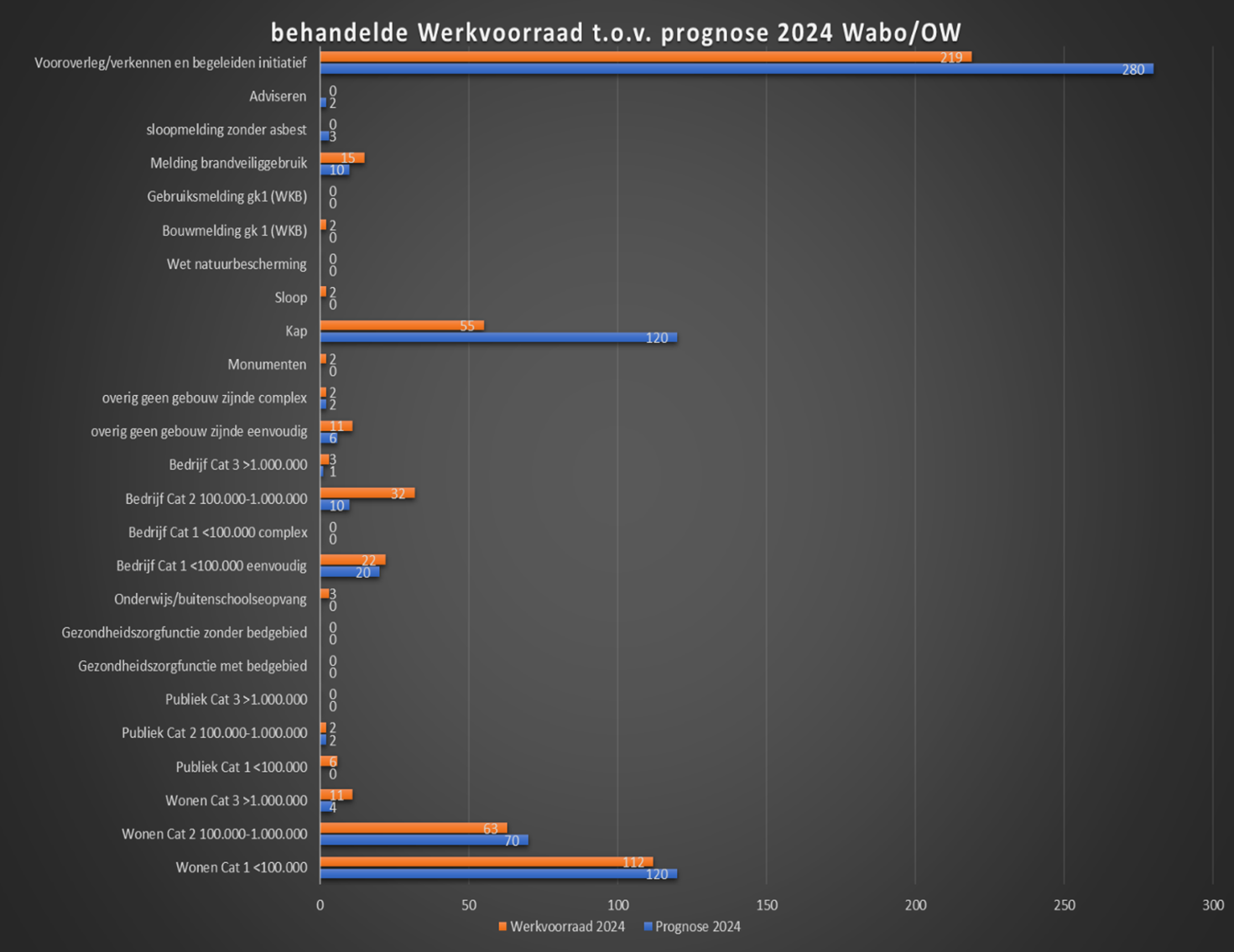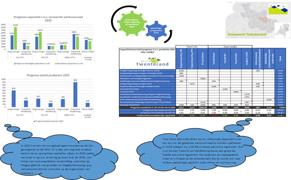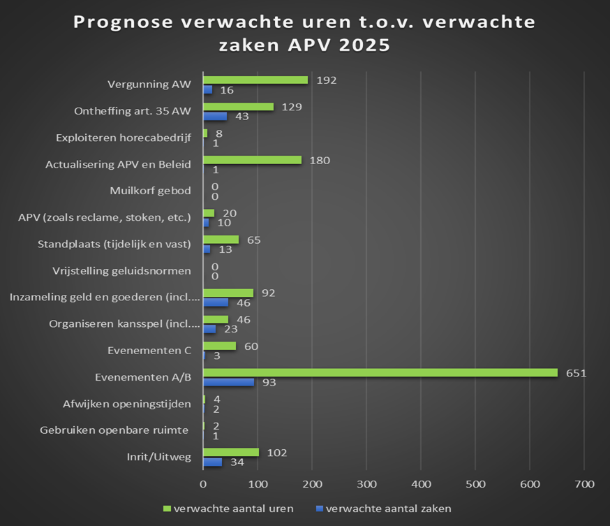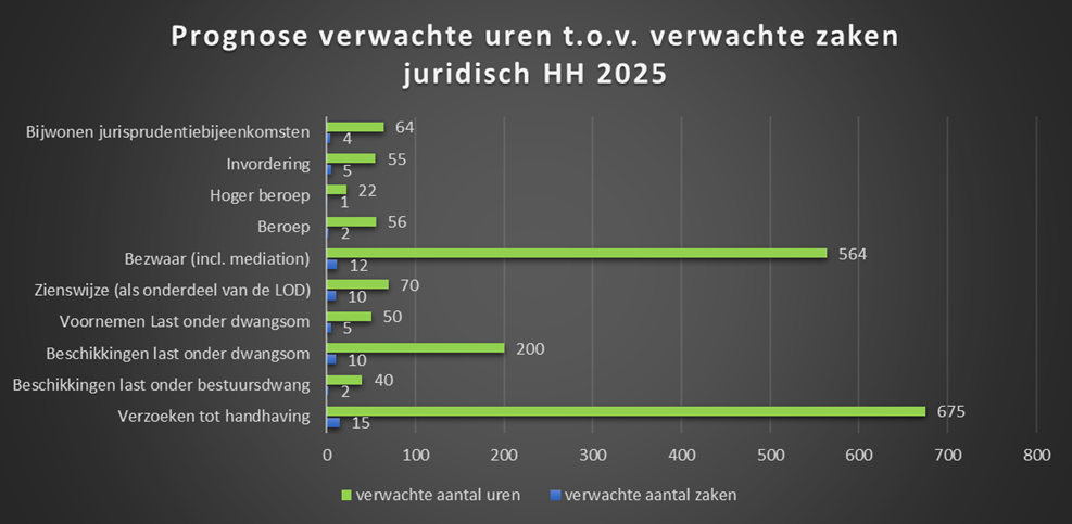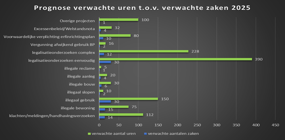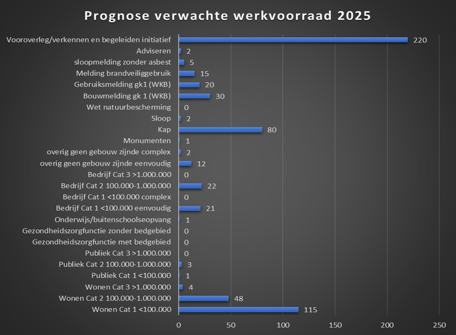 Voor het taakveld Vergunningen is de prognose dat er 405 zaken worden afgehandeld en daarvoor zijn 2246 uren geraamd in 2025. Voor het onderdeel Toezicht en Handhaving zijn is de prognose dat er 511 zaken worden afgehandeld en daarvoor 4280 uren geraamd in 2025. Deze capaciteit zal worden ingezet op de producten overeenkomstig de herziene PDC voor de OW en de daarbij indicatief bepaalde kentallen eind 2024. Voor de gehele prognose van 2025 en relevante ontwikkelingen die mogelijk invloed hebben op de prognose wordt verwezen naar bijlage 4.