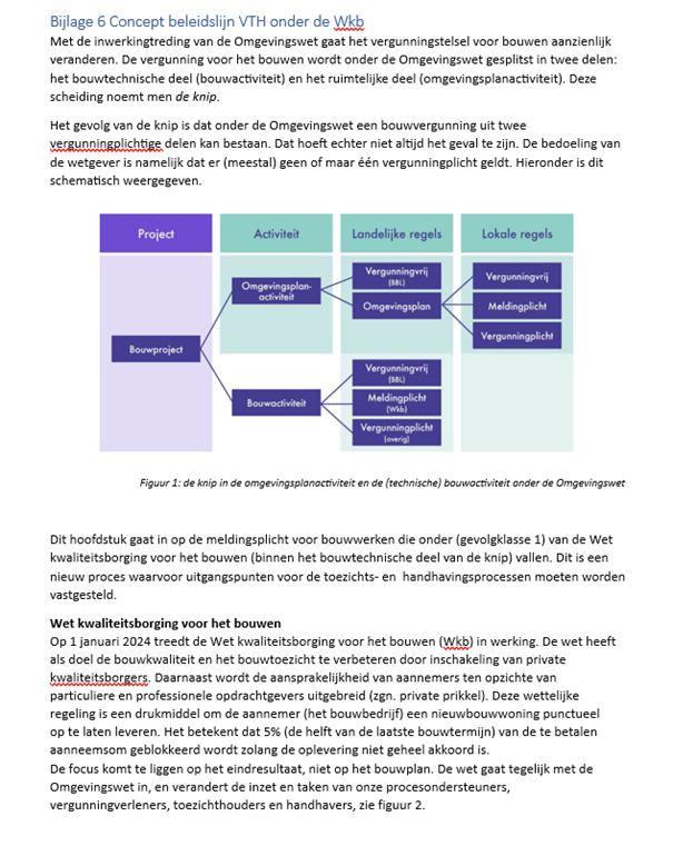 Deze concept beleidslijn VTH onder de Wkb is als bijlage onderdeel van het VTH-beleid 2024-2028 van de gemeente Twenterand. Deze is als concept bijlage opgenomen onder het nieuwe VTH-beleid 2024-2028. Omdat er in 2024 te weinig ervaring is opgedaan met bouwmeldingen onder de Wkb proberen wij deze ervaring op te doen en de werkwijze van deze beleidslijn in 2025 te toetsen op dat onderdeel of het werkbaar is. Aan de hand van de in 2025 opgedane ervaringen zal mogelijk deze beleidslijn worden bijgesteld en daarna worden vastgesteld als definitief onderdeel van het VTH-beleid 2024-2028.