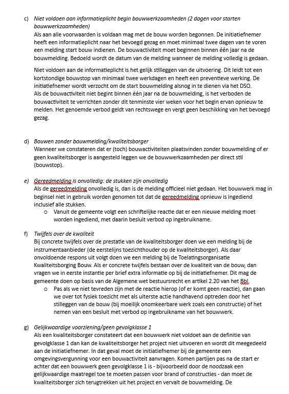 In 2024 hebben we echter weinig tot geen ervaring kunnen opdoen met bouwmeldingen voor gevolgklasse 1 onder de WKB. Er zijn in 2024 maar 2 bouwmeldingen ingediend tot op heden. De verwachting is dat we in 2025 hier wel meer ervaring mee op kunnen gaan doen. Daarom zien we 2025 ook wel als een 2e ervaringsjaar. In 2025 gaan we dus ervaring opdoen en werken volgens de beleidslijn “VTH onder de Wkb” die is opgeteld. Zie bijlage 11.
