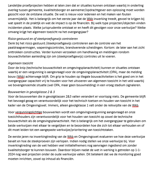 Met de inwerkingtreding van de Omgevingswet per 1 januari jl., hebben we in 2024 onze eerste ervaringen opgedaan met alle nieuwe werkwijzen en producten die deze nieuwe wet met zich meebrengt. Er gingen veel dingen goed maar er kunnen ook nog dingen beter is onze voorzichtige conclusie. Daarnaast zijn er eind 2023 nog heel veel vergunningaanvragen onder de oude- wet en regelgeving (Wabo) ingediend waardoor we in 2024 ook nog veel tijd kwijt waren om deze aanvragen af te handelen. We hadden verwacht op het gebied van bouwtoezicht meer ervaringen met bouwmeldingen, vanuit de WKB, op te kunnen doen dit jaar. Maar er zijn tot op heden nog maar 2 bouwmeldingen ingediend. Dit blijkt een trend te zijn die voor heel Overijssel geld bij navraag. De verwachting is dat dit in 2025 wel toe zal gaan nemen.