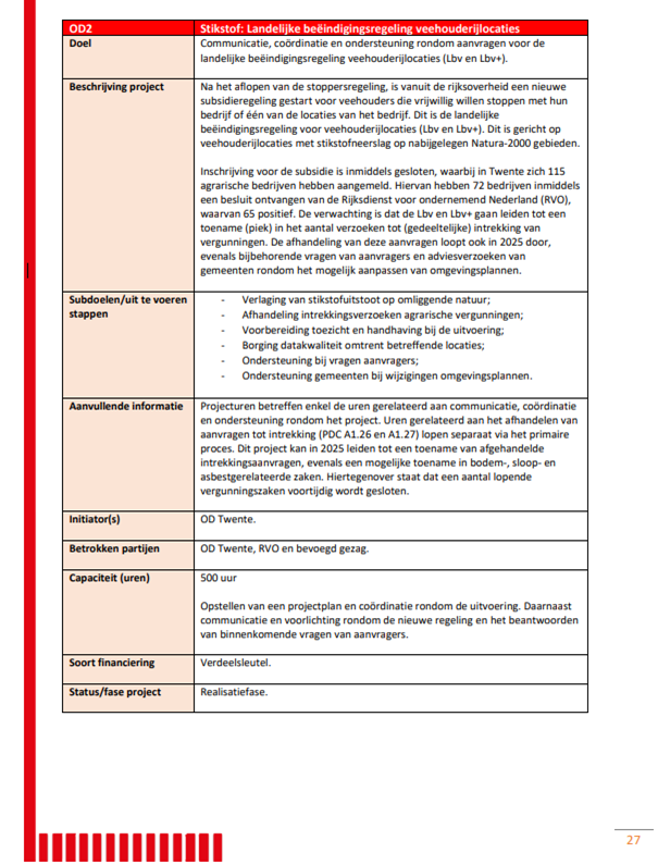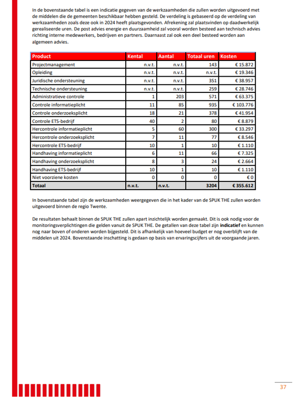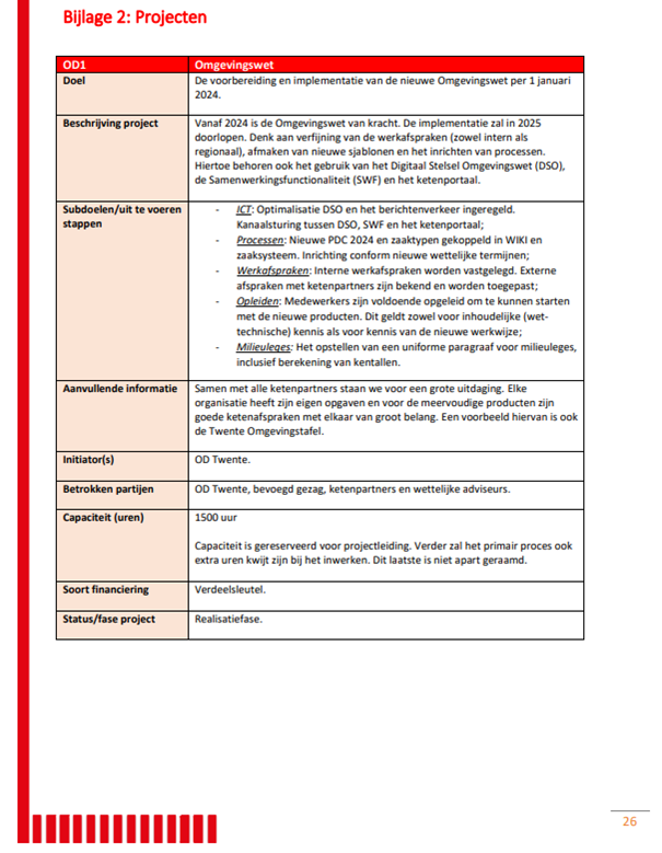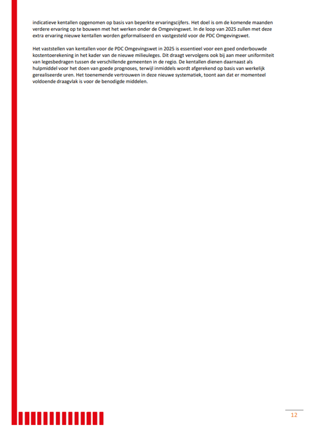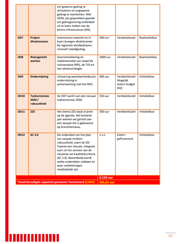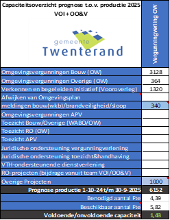 Voor de achterstallig werk vanuit de Wabo is 586 uur geraamd in 2025. Daar borg je eventuele verrassingen mee t.a.v. nog niet afgeronde werkzaamheden. Voor Twentse projecten is 365 uur geraamd en voor diensten voor de regio Twente 695 uur. Dat is fors meer dan voorgaande jaren. Voor de gemeente Twenterand houd dit in dat de ruimte die er was voor eventuele facultatieve milieu taken er nu niet meer is. Het is heel lastig in te schatten door alle wijzigingen of er in 2025 geen overschrijdingen van de in te zetten uren zullen zijn. De gemeente Twenterand gaat maandelijks monitoren vanaf begin 2025 om een vinger aan te pols te houden. Dit omdat er o.b.v. de nieuwe opgestelde PDC en kentallen voor onder de OW toch een risico bestaat dat je sneller door je uren heen bent dan voorzien is (als je niet maandelijks gaat monitoren).