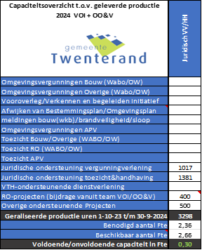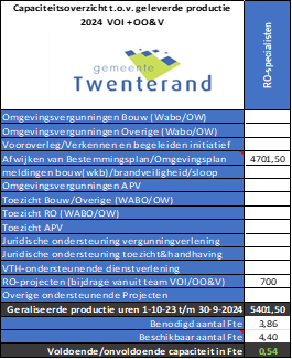 Hieronder volgt een beschouwing van de resultaten die op het moment van schrijven van dit UP bekend zijn in relatie tot prognoses en beleidsdoelstellingen. Het jaarverslag is op het moment van schrijven van dit uitvoeringsprogramma nog niet opgesteld. De ODT hanteert een periode van januari tot januari, terwijl in Twenterand de cijfers van oktober tot oktober worden gebruikt. Uitgegaan is van de rapportage over de eerste drie kwartalen van 2024 van de ODT, in combinatie met de cijfers van het laatste kwartaal van 2023 (waarvan de cijfers vervat zijn in het jaarverslag over 2023). Inmiddels is het door verbetering van de monitoring bij de ODT makkelijker realtime gegevens de genereren. Om die reden zijn de cijfers voor 2024 al verzameld, m.u.v. de projecten en de overhead uren. Mogelijk wijken de cijfers in het jaarverslag van 2024 in geringe mate af van de aangeleverde cijfers uit PowerBI.