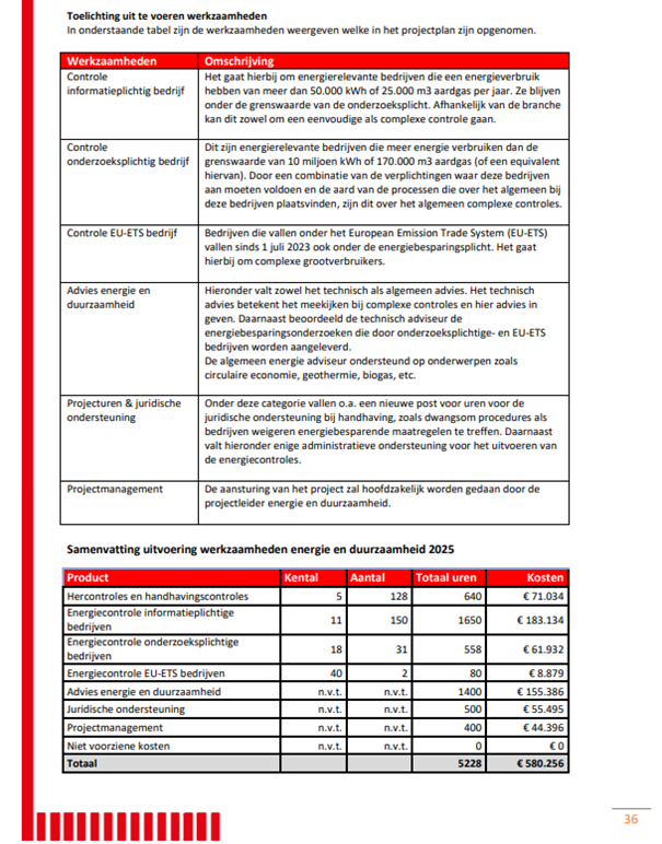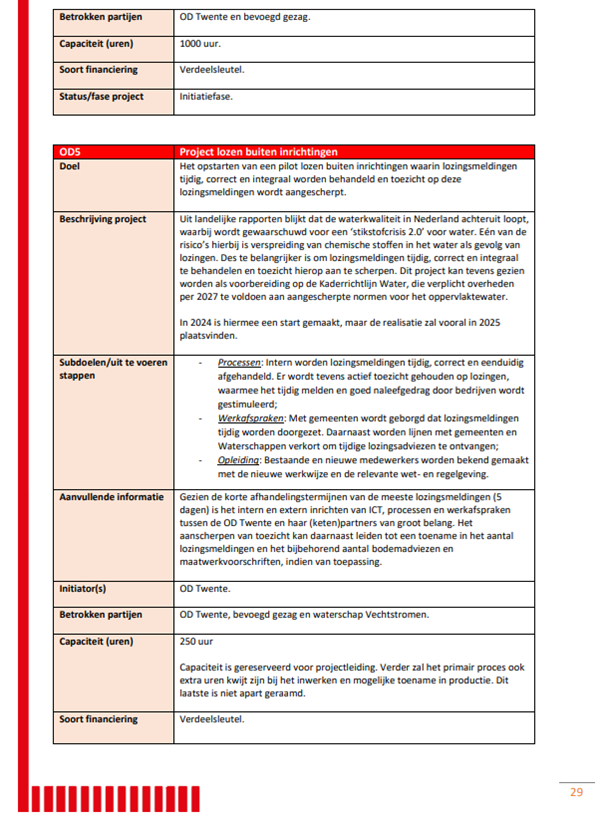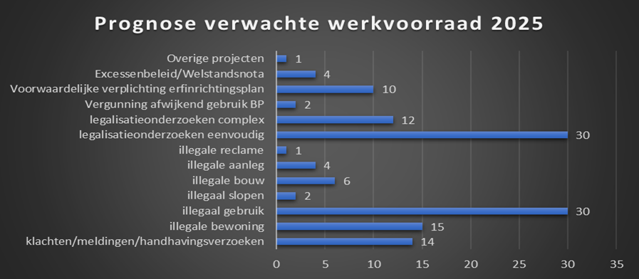 In de prognose is rekening gehouden met projectmatige controles, zoals controleren op overlast van campers en caravans, maar ook controles op zendmasten, in 2025 is daar capaciteit voor. Dit moet in 2025 nog concreet worden ingevuld. Het streven is hier meer preventief te handelen, middels projectmatig toezicht. Tevens willen we de systemen t.b.v. de monitoring beter inrichten. Er is hier 694 uur voor geraamd onder Overige projecten.