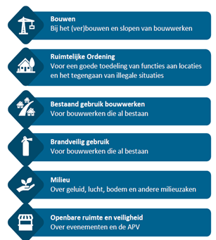 Dat doen we voor de VTH-taken die binnen de disciplines van bouwen, ruimtelijke ordening, brandveilig gebruik, milieu en openbare orde en veiligheid vallen. Zie ook de afbeelding hiernaast.