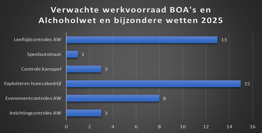 In de geplande werkvoorraad is rekening gehouden met de indicatoren en streefwaarden uit het programma Ruimte (>25 controles A/B evenementen, >1 controles C evenementen, >13 controles leeftijd Aw en <210 klachten). Gelet op de gerealiseerde werkvoorraad in 2024 is de streefwaarde voor het aantal klachten aan de hoge kant. Deze kunnen voor de programmabegroting van 2026 worden aangepast.