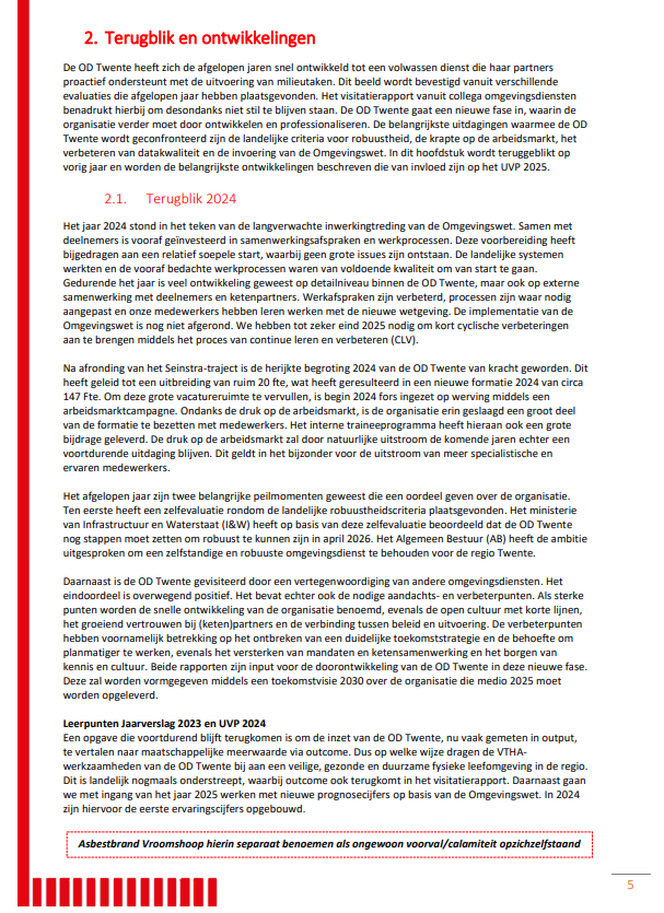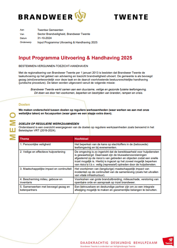 De Brandweer Twente doet verslag van haar taken in een separaat jaarverslag. Aangezien de Brandweer Twente het definitieve jaarverslag in februari 2025 aan de Twentse gemeenten stuurt, is er een concept jaarverslag opgenomen in bijlage 1 van dit UP.