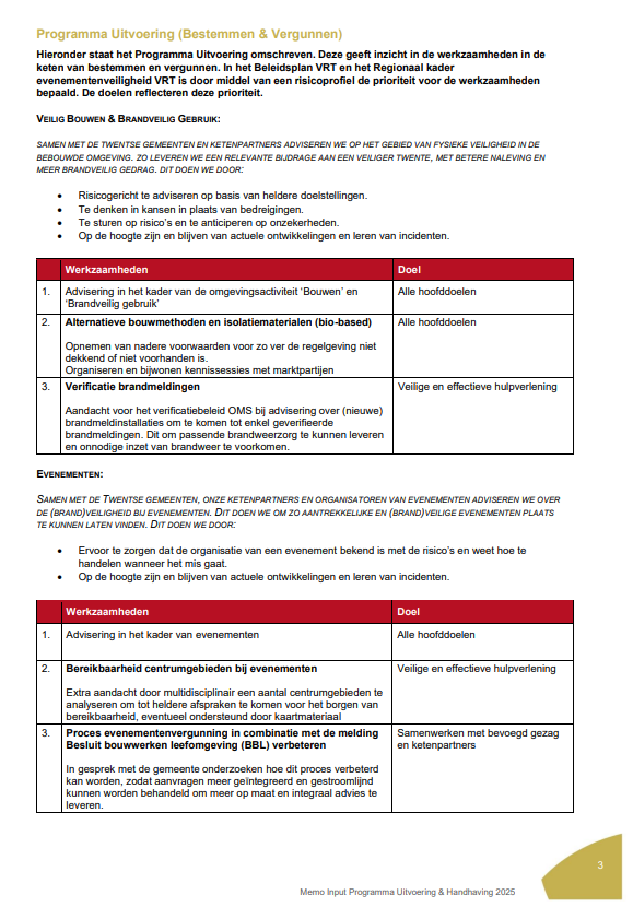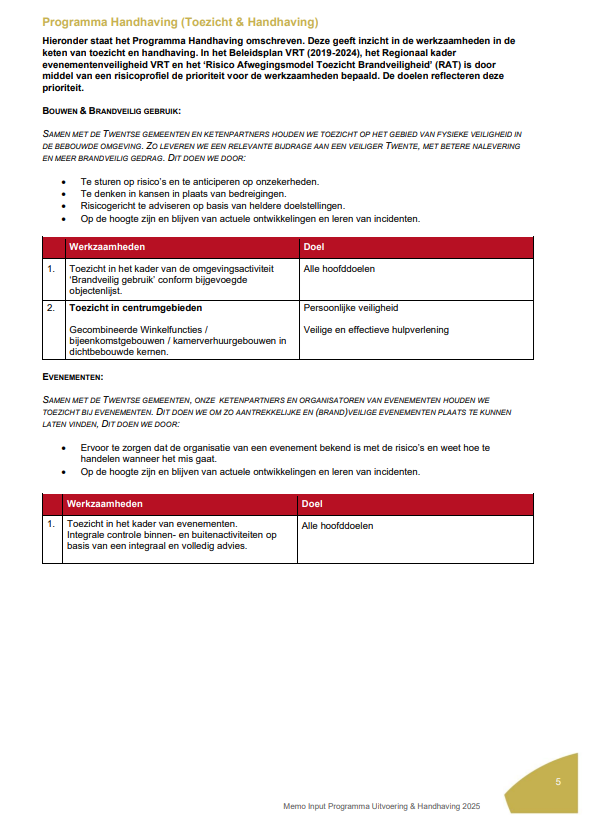 In het Beleidsplan VRT (2019-2024), het Regionaal kader evenementenveiligheid VRT en het ‘Risico Afwegingsmodel Toezicht Brandveiligheid’ (afgekort: RAT) is door middel van een risicoprofiel de prioriteit voor de werkzaamheden bepaald. De doelen reflecteren deze prioriteit.