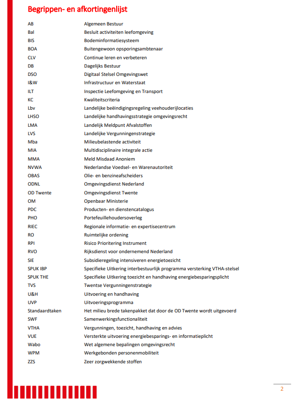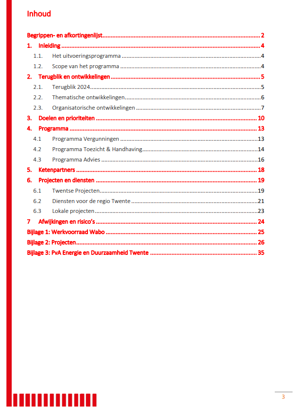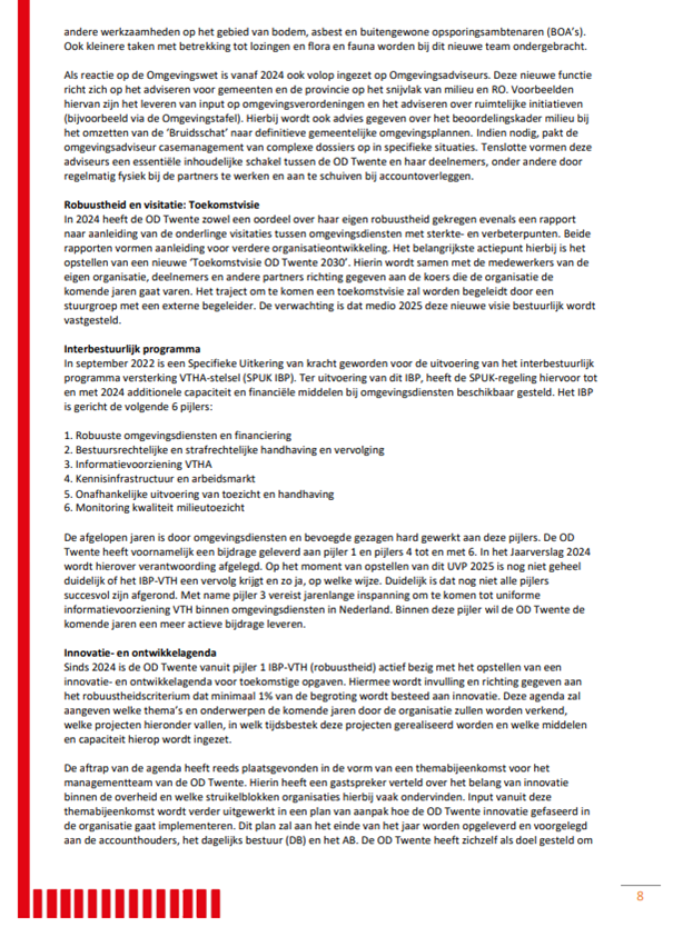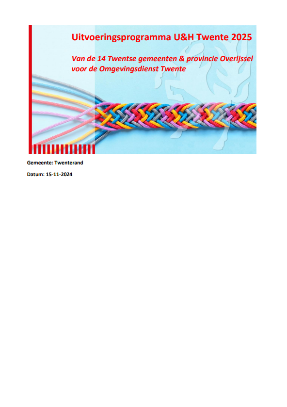 In 2024 is het nieuwe VTH beleidsstuk “Integrale Uitvoerings- en handhavingsstrategie 2024 -2028” vastgesteld. Zie bijlage 12 . Dit beleidsstuk vormt het kader/kapstok voor het kwaliteitsniveau van de uitvoering van o.a. de wettelijke VTH-taken onder de nieuwe Omgevingswet. Dit beleidsstuk is niet in beton gegoten en zal de komende jaren nog verder ontwikkeld en ingekleurd gaan worden naargelang wij meer ervaring met de Omgevingswet gaan opdoen. O.a. de “Omgevingsvisie” en de beleidslijn” VTH onder de Wkb” zullen verder ontwikkelt gaan worden de komende jaren. Het in 2023 vastgestelde Twente brede omgevingsbeleid voor milieu maakt integraal onderdeel uit van dit nieuwe beleidsstuk. Dit nieuwe beleidsstuk is dan ook de nieuwe onderlegger voor het uitvoeringsprogramma 2025.