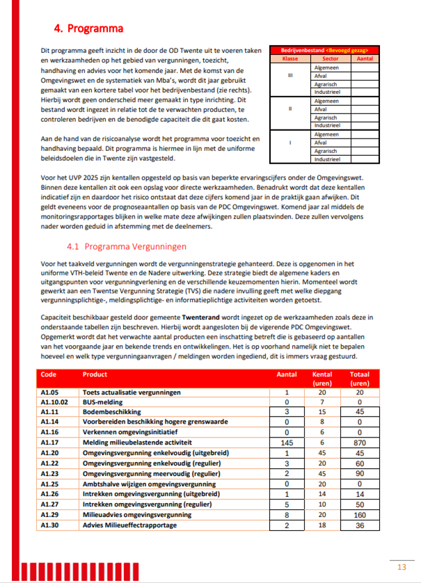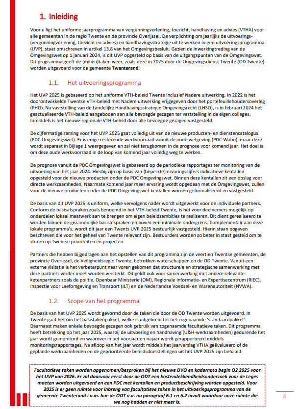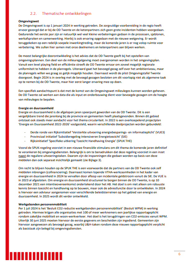 Voor de milieutaken, belegd bij de omgevingsdienst Twente (hierna: ODT), is het Twentebrede uniforme VTH-beleid in 2023 herzien en vastgesteld in 2023.