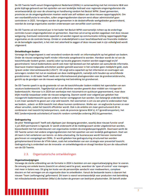 Vanaf 1 januari 2024 is de OW ingegaan en vallen alle milieubelastende activiteiten onder het BAL. Daardoor hoeven er mogelijk minder vergunningen aangevraagd te worden voor milieubelastende activiteiten en zijn de meldingen vereenvoudigd. Wat ons daar op valt is dat de nieuwe kentallen van de ODT hiervoor hoger zijn dan bij een melding onder de Wabo. Terwijl je onder de OW bijna geen werk meer hebt met een melding afhandelen in verhouding. Ook is er een nieuwe categorie toezichtcontrole qua product bedacht voor complexe bedrijven waar een hoger kental aanzit dan bij een voormalig klasse 3 bedrijf. Dit baart ons wel zorgen. Wij zullen daarom zelf nog meer gaan monitoren om de vinger aan de pols te houden of we in 2025 niet uit de uren gaan lopen.
