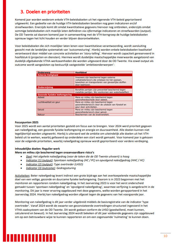 Deze Doelen en Indicatoren zijn onderdeel van het VTH-beleid Twente (ODT). Een verbeterpunt voor 2024 was dat er verder moest worden gewerkt aan het ontwikkelen van streefwaarden bij de doelen en indicatoren voor de milieutaken die belegd zijn bij de ODT, zodat die betrokken konden worden bij het uitvoeringsprogramma 2025. Dat is helaas niet gelukt. Het nieuwe uitgangspunt is dat dit in 2025 alsnog wordt ontwikkelt door de kerngroep VTH-beleid samen met de ODT. Zodat het voor het uitvoeringsprogramma van 2026 alsnog kan worden gebruikt.