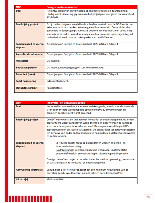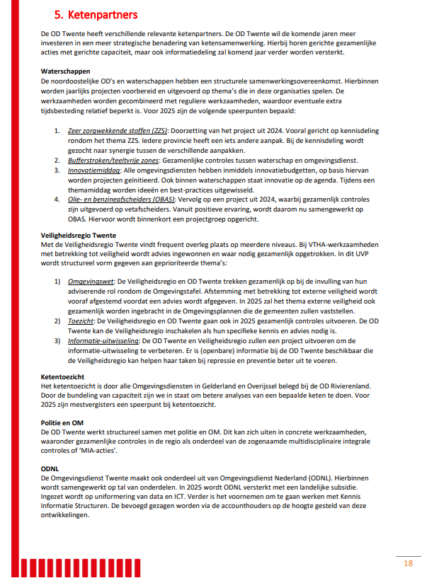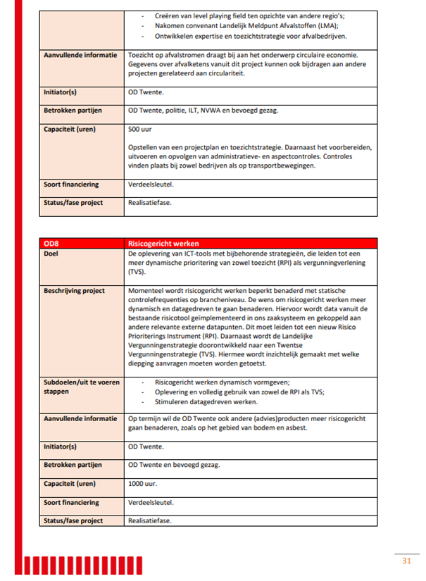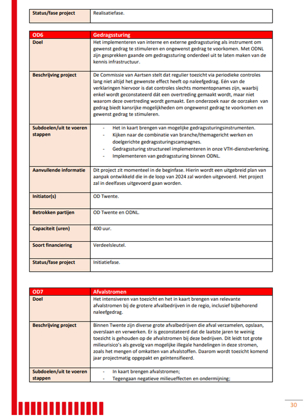 Daarnaast is ook het VTH beleid Twente in 2022 geactualiseerd. Deze is in 2023 door het college van B&W van de gemeente Twenterand vastgesteld. In het VTH beleid Twente staan doelen en indicatoren voor het uitvoeren van de milieu gerelateerde VTH taken zoals de gemeente Twenterand die bij de ODT belegd heeft. De ODT was voornemens om in 2024 streefwaarden te ontwikkelingen die aansluiten op de indicatoren uit bovenstaand tabel. Dat is helaas nog niet gelukt. Wel zijn er vanuit de kerngroep twente breed beleid gesprekken gevoerd met de ODT. Er wordt nu eerst een memo opgesteld. Daarna wordt de memo besproken met de ODT en zal er een gezamenlijk werkgroep worden opgesteld om in 2025 tot goede en voor de ODT ook te monitoren streefwaarden te komen.