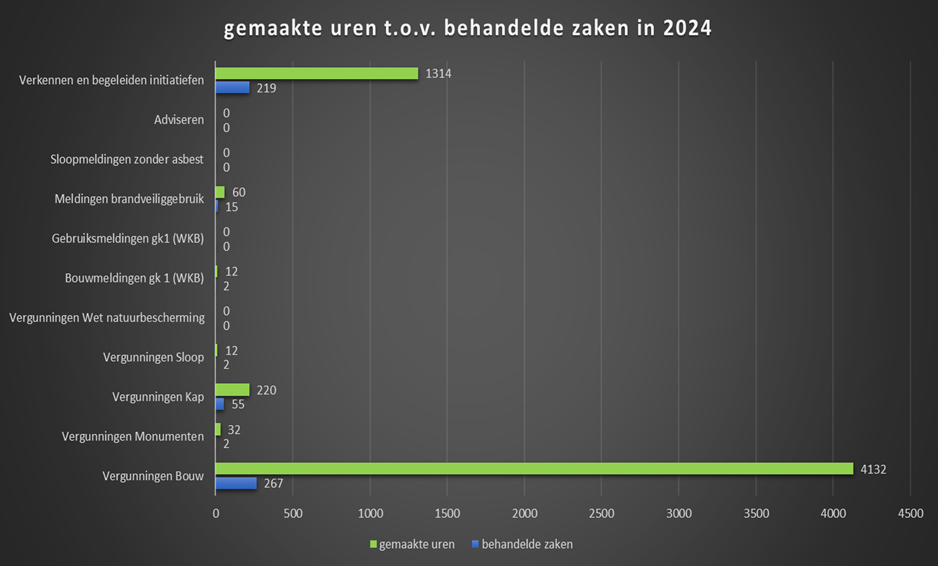 Uit de ‘in 1 oogopslag’ zoals hierboven opgenomen, blijkt dat we in 2024 meer uren aan producten hebben besteed dan werd voorspeld. Daaruit kunnen we opmaken dat de fysieke leefomgeving in Twenterand volop in ontwikkeling was in 2024 maar dat ook nog veel mensen hunnen plannen wouden indienen voor eind 2023 onder de oude- wet en regelgeving (Wabo). Er zijn toen totaal 30 vergunningaanvragen meer ingediend dan gebruikelijk is voor diezelfde periode in de jaren ervoor. We hebben onder andere vooroverleggen gevoerd met initiatiefnemers, vergunningen voor woningen verstrekt, hielden toezicht op het gebruik van gronden en traden zo nodig op tegen fout geparkeerde voertuigen. En dat is nog maar een kleine greep uit de vele taken die we in 2024 behandeld hebben.
