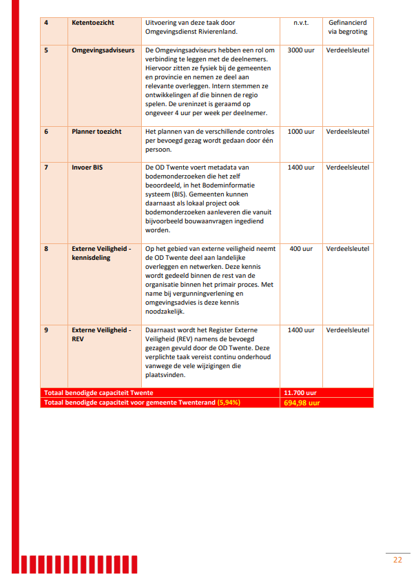 Hiervoor zijn gezamenlijk 2 fte benodigd volgens de criteria. De gemeente Twenterand heeft voor deze activiteiten zelf een stedenbouwkundige voor 0,5 fte in dienst. Gezien de omvang en grote van de gemeente Twenterand en de hoeveelheid werk uit deze 4 activiteiten daadwerkelijk komt in de praktijk kan onze stedenbouwkundige het werk voldoende kwalitatief en beheersbaar uitvoeren. Mocht er extra capaciteit benodigd zijn i.v.m. ziekte of projecten dan wordt er aanvullend ingehuurd.