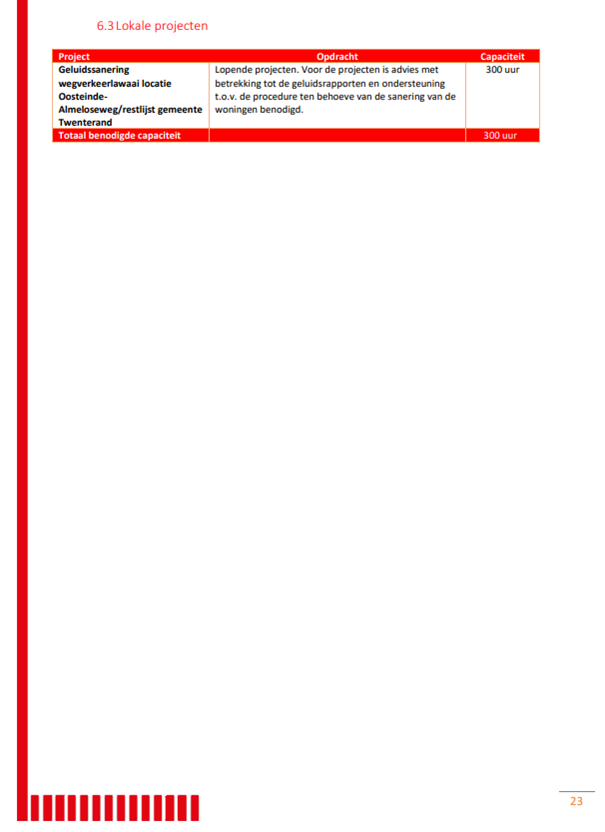 De aanlevertermijn liet te wensen over. Het was vaak onduidelijk wanneer een advies verwacht mocht worden. Met name gold dat voor de adviezen over luchtkwaliteit. Hierover zijn diverse memo’s gedeeld met Twentse partners en is meerdere malen besproken in het AB. Het te laat aanleveren van adviezen vormt een risico voor de doorlooptijden van wettelijke procedures. De gevolgen hiervan kunnen een vergunning van rechtswege of een ingebrekestelling zijn. In 2024 heeft de ODT ook weer trainees proberen op te leiden. Die zouden dan in 2025 ingezet kunnen worden zodat verwacht wordt dat de aanlevertermijnen verkort kunnen worden. Aangezien het hier specialistische milieuadvisering betreft kun je niet verwachten van trainees dat ze binnen een jaar al heel veel kennis hebben van de materie waarbinnen ze hun werk moeten doen. Aangezien dit ook erg afhankelijk is van kennis vergaren en ervaring opdoen met advisering op deze vakgebieden.
