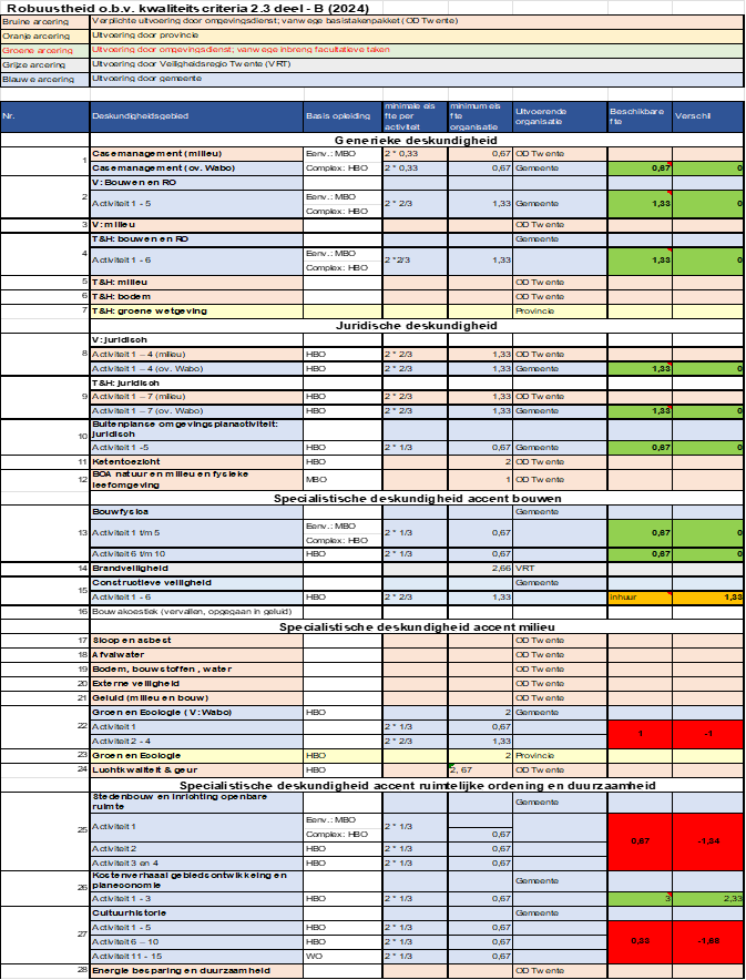 Hiervoor zijn minimaal 2 x 2/3 fte benodigd volgens de criteria. De gemeente Twenterand Heeft zelf geen constructeurs in dienst. Onder de omgevingswet is per 1-1-2024 een groot gedeelte van de werkvoorraad aan bouwvergunningen voor het bouwtechnische deel nietmeer vergunning plichtig. Daarom heeft de gemeente Twenterand er voor gekozen om een extern bureau (Interconcept) de constructieberekeningen, waar nodig, te latenbeoordelen/toetsen o.b.v. de BBL op ontvankelijkheid en inhoud. Naar onze mening voldoen we zo ook om de constructieve veiligheid bij bouwtechnische aanvragen te borgen los van de minimale benodigde 2 x 2/3 fte die wordt geëist vanuit de criteria.
