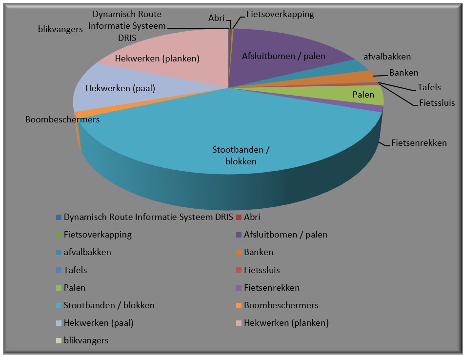 Eind 2015 is het areaal straatmeubilair geïnventariseerd door onze eigen mensen van Technisch Wijkbeheer. Tijdens deze inventarisatie op straatniveau is vooral gekeken naar het soort straatmeubilair en de algehele status. Aan de hand van het turven op straat is de volgende lijst ontstaan. Voor een compleet overzicht zie bijlage 1 Inventarisatie straatmeubilair.