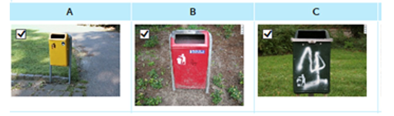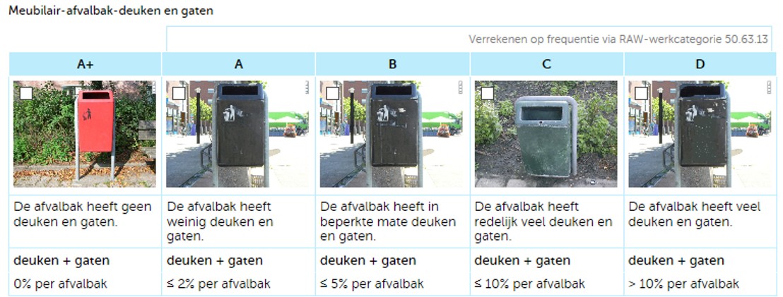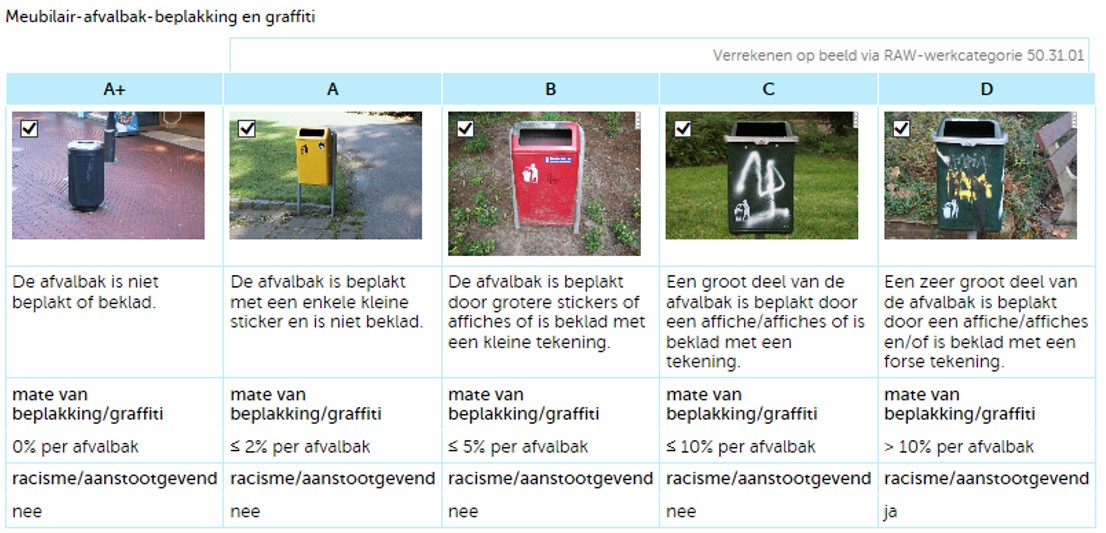Kwaliteit A: de afvalbak is beplakt met een kleine sticker en is niet beklad, maximaal 2% is beplakt en is niet voorzien van racistische of aanstootgevende teksten;