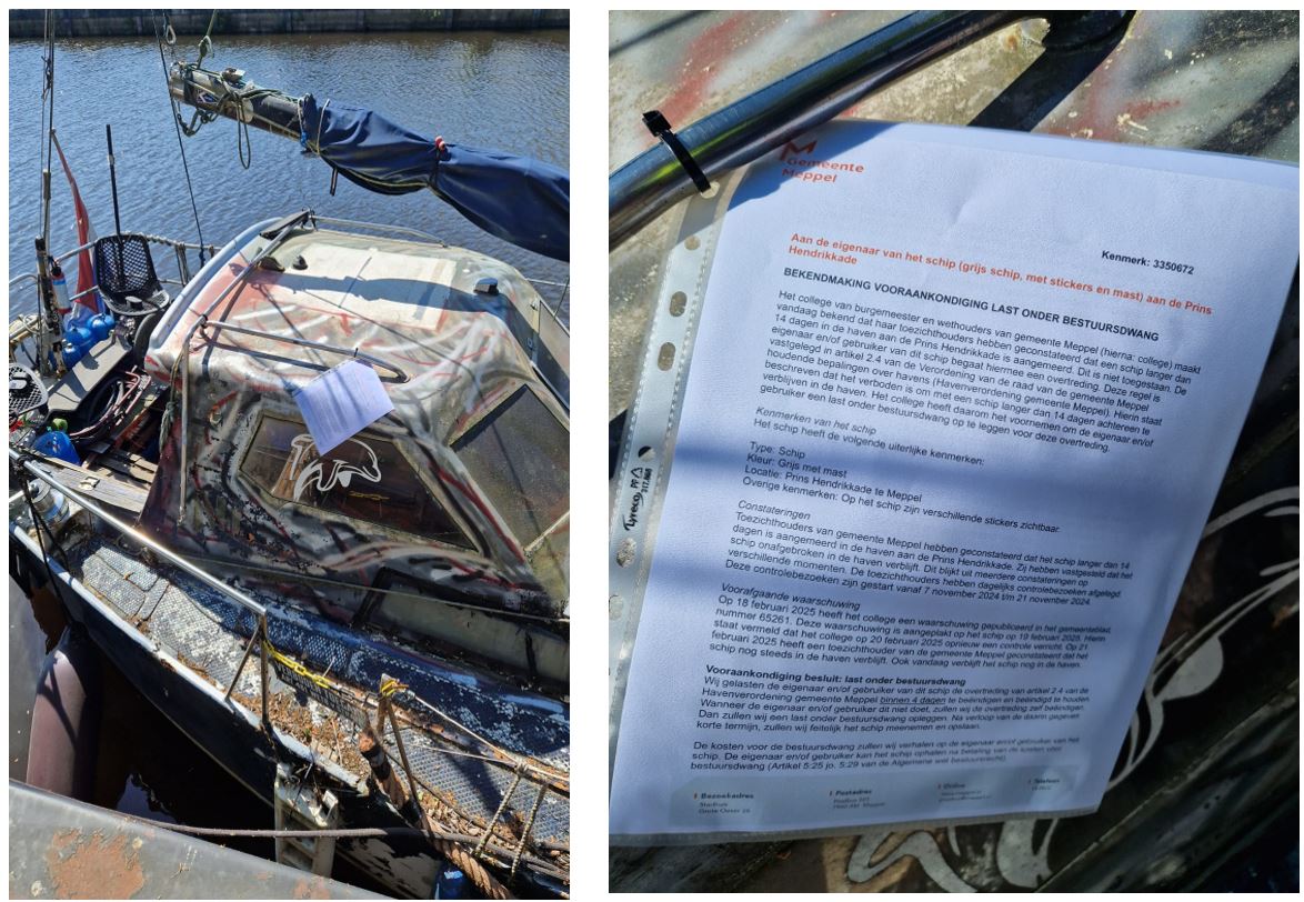 Toepassen last onder bestuursdwang voor een grijs schip, met stickers en mast aan Prins Hendrikkade te Meppel