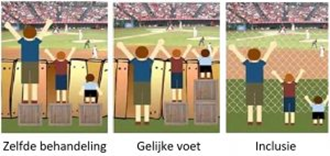 Als iedereen hetzelfde behandeld wordt, betekent het dat er mensen zijn die niet mee kunnen doen. Het lijkt wel eerlijk dat iedereen 1 kistje heeft, maar dat is het niet. Niet iedereen heeft hetzelfde nodig. Soms is iets extra’s of iets anders nodig om deel uit te kunnen maken van de samenleving. Dan wordt voor iemand een oplossing gevonden zodat deze persoon toch mee kan doen. Iemand kan door individuele aanpassingen op gelijke voet meedoen.
