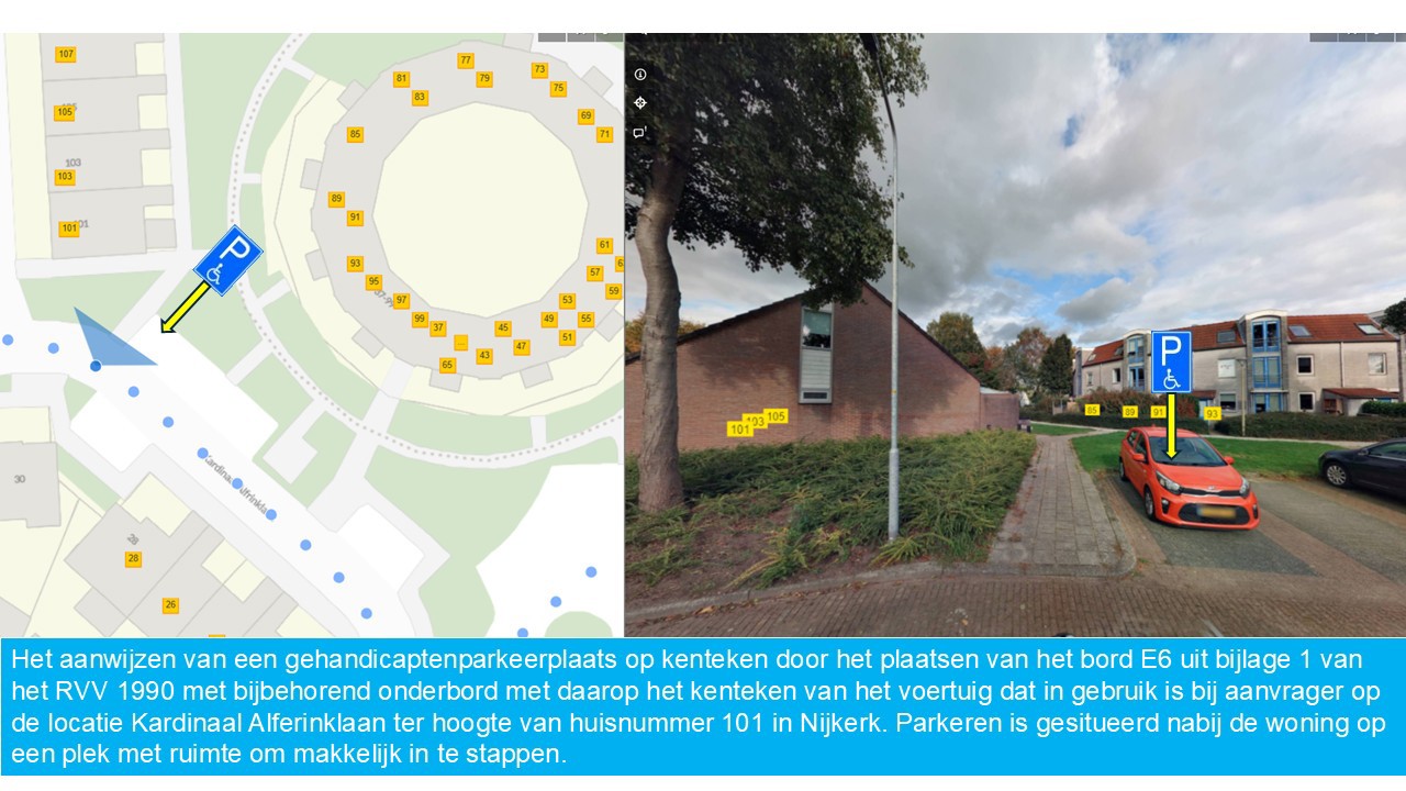 Het aanwijzen van een gehandicaptenparkeerplaats op kenteken door het plaatsen van het bord E6 uit bijlage 1 van het RVV 1990 met bijbehorend onderbord met daarop het kenteken van het voertuig dat in gebruik is bij aanvrager op de locatie Kardinaal Alferinklaan ter hoogte van huisnummer 101 in Nijkerk;