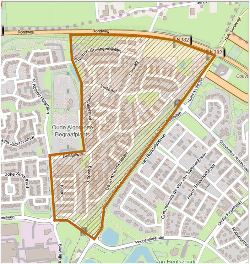 Aangewezen gebied in de wijk Tuindorp in de gemeente Coevorden geheel of deels, zoals hieronder weergegeven op de bij deze noodverordening behorende en als zodanig situatiekaart, onder andere, de straten: Doctor J.C. Homanstraat, Suzanne Groenweglaan, Looweg, Wethouder Donkerstraat, Irisstraat, Clematisstraat, Rozenplein, Secretaris Bruintjesstraat, Ballastweg, David Krammersstraat, Hyacinthstraat, Papaverstraat, Anemoonstraat, Anjerstraat, Ingenieur Arjen Vonkweg, Generator, Kabel, Signaal, Transformator en Schakel.
