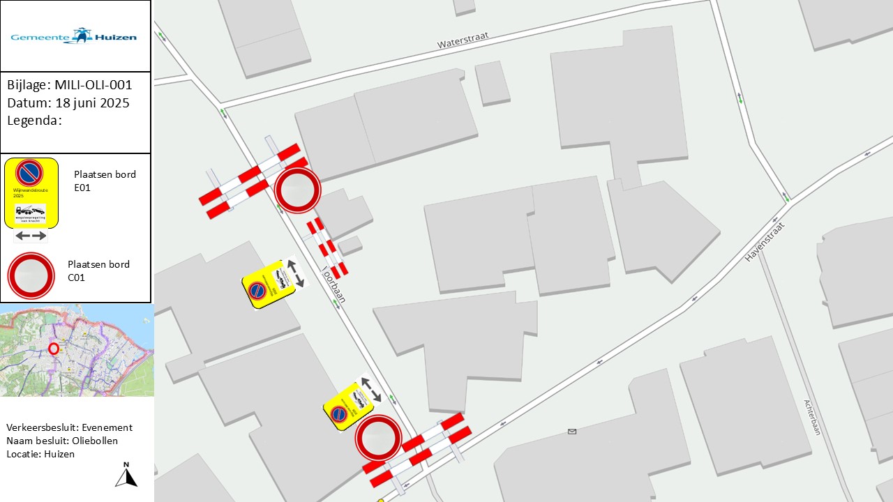 Op grond van voorgaande overwegingen besluiten burgemeester en wethouders van Huizen tot het afsluiten van Voorbaan zoals weergegeven op de bij dit besluit behorende tekening gedurende de periode van vrijdag 31 december 2025 van 15.00 uur tot 19.00 uur. Tijdens deze afsluiting zullen de borden C01 en E01 met onderbord met tekst "Oliebollenbal 31 december 2025 15.00 - 19.00 uur” zoals bedoeld in bijlage 1 van het Reglement Verkeersregels en Verkeerstekens 1990;